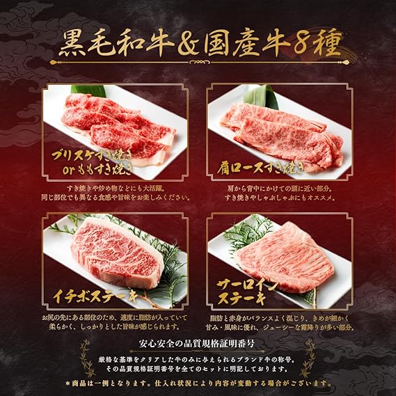 お届け内容 黒毛和牛希少部位60g(仕入状況により選定)、黒毛和牛バラ焼肉用60g、黒毛和牛肩ロースすきしゃぶ用80g、国産牛もも焼肉用60g、黒毛和牛ブリスケ焼肉用60g、黒毛和牛ランプorブリスケor国産牛とうがらしor国産牛ももすきしゃぶ用80g、黒毛和牛サーロインステーキ100g、黒毛和牛赤身ステーキ100g(イチボorランプ)