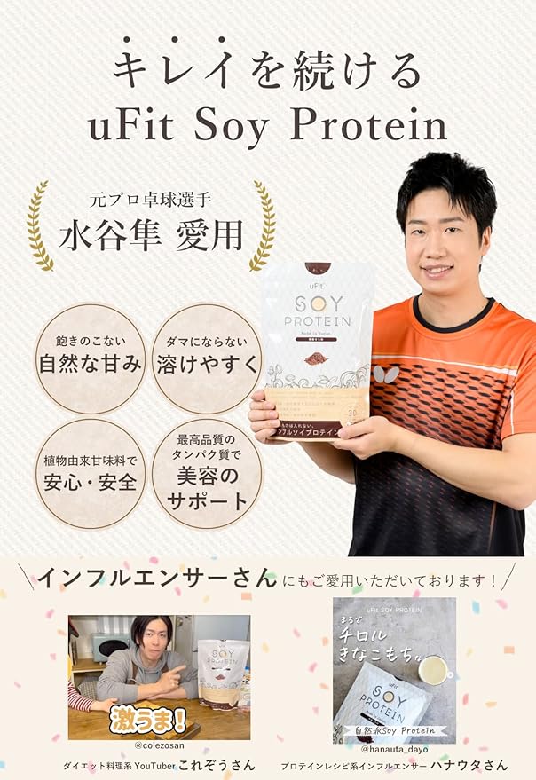 uFitソイプロテインは、保存料・着色料・香料を一切入れていないプロテインです。プロテインを飲む本来の目的に立ち返り、「より健康的にタンパク質を摂取する」ことにフォーカスを当て、甘いから・美味しいからだけではなく、より健康的になれるプロテインを開発しました。