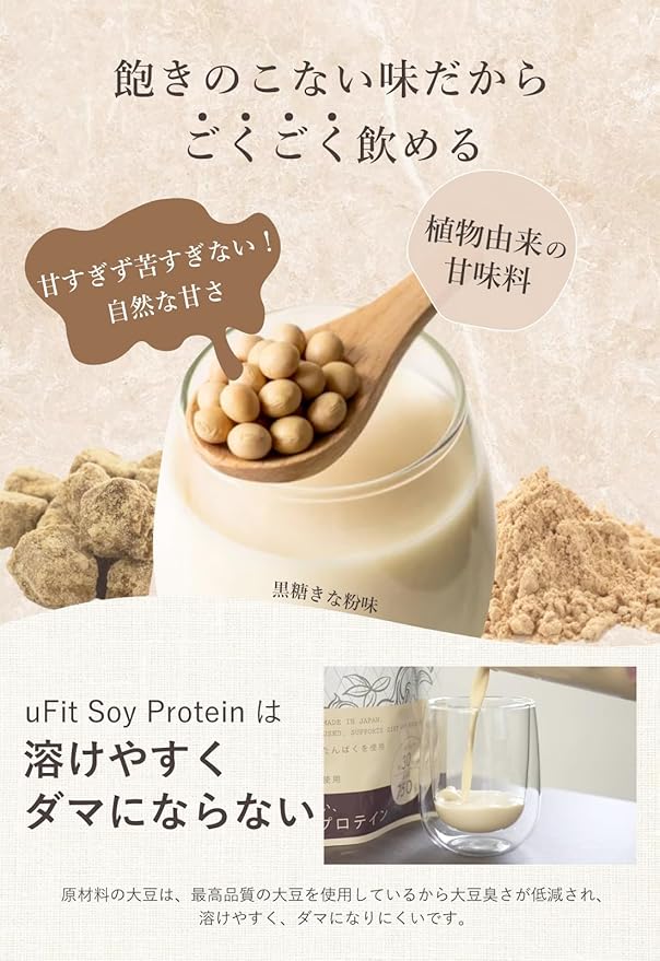 【日本国内製造】uFit Soy Protein ソイプロテイン 黒糖きな粉 750g 甘さ控えめ 溶けやすい 植物由来甘味料 ステビア 遺伝子組み換えでない 置き換え 大豆プロテイン a