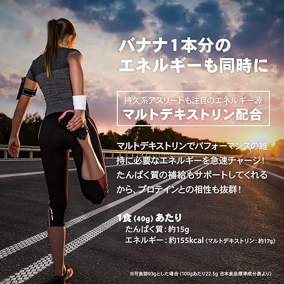 【 持久系アスリートも注目 】 持久系 アスリート も 注目 の エネルギー源 。 マルトデキストリン 配合。 パフォーマンス の 維持 に 必要 な エネルギー を 急速 チャージ ! また、 たんぱく質 の 補給 も サポート してくれる マルトデキストリン は、 プロテイン と