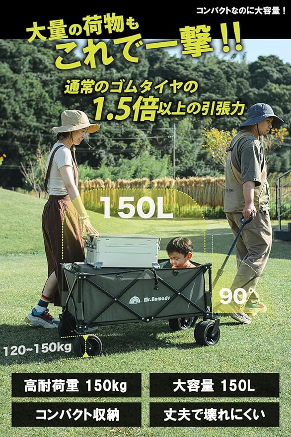 MR. NOMADS 【ラグビー日本代表使用】 キャリーワゴン キャリーカート 4輪 こども乗せれる 折り畳み 軽量 大容量 150L コンパクト 大きいタイヤ 頑丈 耐荷重150kg 自立収納 ワンタッチ収束式 アウトドアワゴン キャンプ ワゴン カート 子供 (KW001 Olive) a