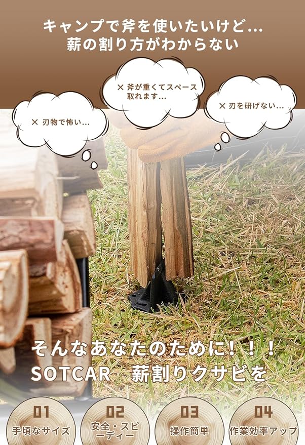 【 新世代の薪割りクサビ 】薪を自分でつくる場合、人力なら薪割り斧、電動なら電動薪割り機を使うのがポピュラーだが、今回、第三の方法として「新世代の薪割りクサビ」が登場しました。薪割りを楽しいアクティビティにグレードアップする画期的なアイテムです。斧や鉈、ナタなどよりも、力をさほど入れなくとも薪が割れますので、より安心安全、女性やお子様、高齢者も楽しんで薪割りができます。