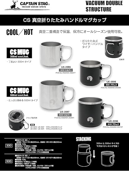 キャプテンスタッグ(CAPTAIN STAG) アウトドア コップ マグカップ マグ カップ タンブラー CS 真空折りたたみハンドルマグカップ 300ml・500ml ステンレス製 シルバー/ブラック UE-3595/UE-3596/UE-3597/UE-3598 a