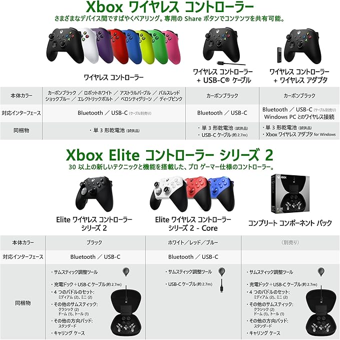 同梱物:Xbox Elite ワイヤレス コントローラー シリーズ 2 Core 本体 (3.5mm ステレオ オーディオ ジャック 付き)、交換可能な方向パッド (1 つ)、交換可能なサムスティック (1 セット)、サムスティック調整ツール、USB-C ケーブル