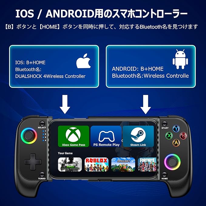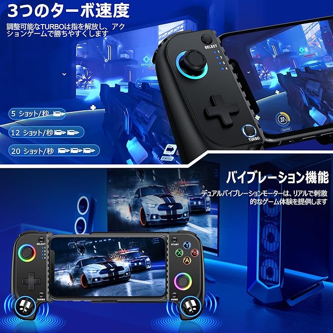 スマホコントローラー- iPhone/Androidに対応、ケースサポート、RGB搭載、ホール効果ジョイスティックがクラウドゲーム、Fortnite、CoDモバイルをプレイするために最適 c
