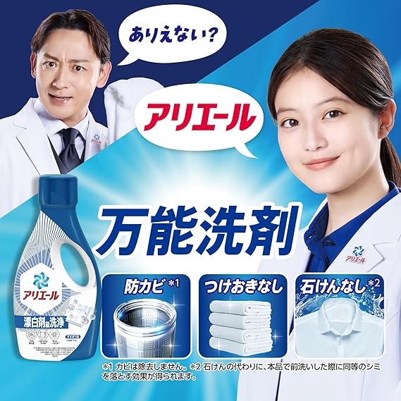 万能洗剤 1本で(1)洗濯槽防カビ、(2)つけ置きなしでも蓄積臭はがす、(3)せっけんなしでもシミ一発スッキリ *P&G調べ。ニオイの度合いで消臭の程度は異なります。汚れの度合いにより、汚れ落ちの程度は異なります。カビは除去できません。