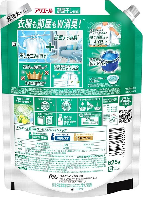 アリエール 洗濯洗剤 液体 超抗菌プレミアム 部屋干し超消臭 天日干し級にさわやかな香り 詰め替え 625g a