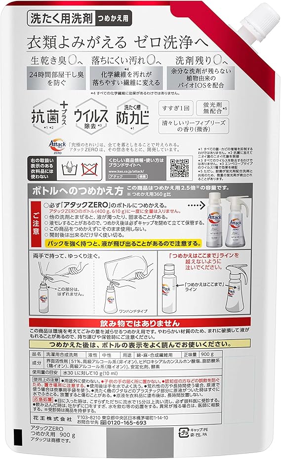 【大容量】アタック ゼロ(ZERO) 液体 洗濯洗剤(Laundry Detergent) 詰め替え 900g (清潔実感! 洗うたび白さよみがえる) リーフィブリーズ a