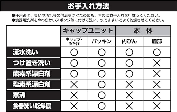 品名:ステンレス製携帯用まほうびん、実容量:1.2L、保冷効力:9度以下(6時間)、素材・材質:内びん/ステンレス鋼、胴部/ステンレス鋼(ポリエステル粉体塗装)、ふた栓・キャップ/ポリプロピレン(耐熱温度100度・耐冷温度-20度)、開閉ボタン・リング/ABS樹脂(耐熱温度80度・耐冷温度-20度)、パッキン/シリコーンゴム(耐熱温度180度・耐冷温度-20度)