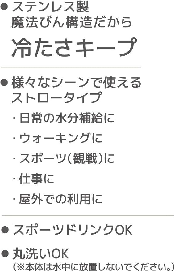 素材・材質:内びん/ステンレス鋼、胴部/ステンレス鋼(アクリル樹脂塗装)、フタ・キャップ本体/ポリプロピレン、飲み口/シリコーンゴム、ストロー/ポリエチレン、パッキン/シリコーンゴム