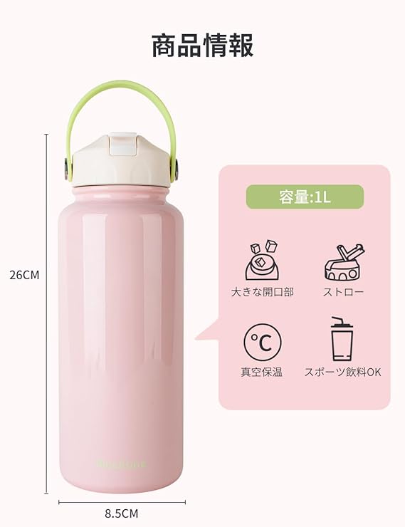 Blackube 水筒 ストロー 1リットル 真空二重構造スポーツボトル 保冷 大容量 水筒, ステンレス製魔法びん 女の子 男の子 タクシー運転手や屋外旅行が好きな人に最適です a