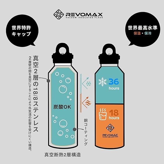 【REVOMAX公式 】20oz 592ml キャップ無し 炭酸対応 ステンレスボトル 18時間保温 36時間保冷 真空断熱 水筒 ギフト (Neon Lime) a