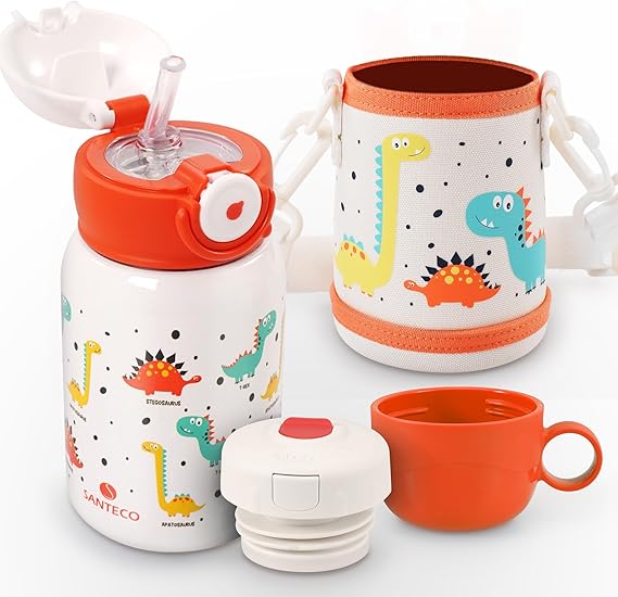SANTECO 水筒 MARA 魔法瓶 450ML 子供用 ストロー付き 直飲み 2Wayタイプ スポーツドリンク対応 炭酸対応 保冷 保温 真空断熱 広口 316ステンレススチール おしゃれ 可愛い 子ども 小学生 キッズ 男の子 女の子 恐竜 a