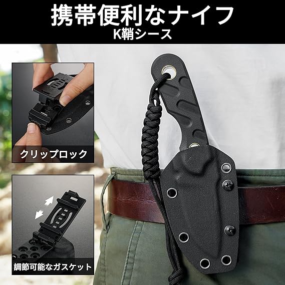 【D2ダイス鋼ブレード&G10ハンドル】ブレードはD2鋼を採用して、切れ味抜群で、優れた耐摩耗性を持っています。G10ハンドルはガラス繊維を積層し固めた材料です。耐衝撃性が高く、伸縮しないです。水に強く耐久性にも非常に優れます。濡れた場合にも滑らずに使用ができ、表面の仕上げによって極めて滑りにくいことが可能です。