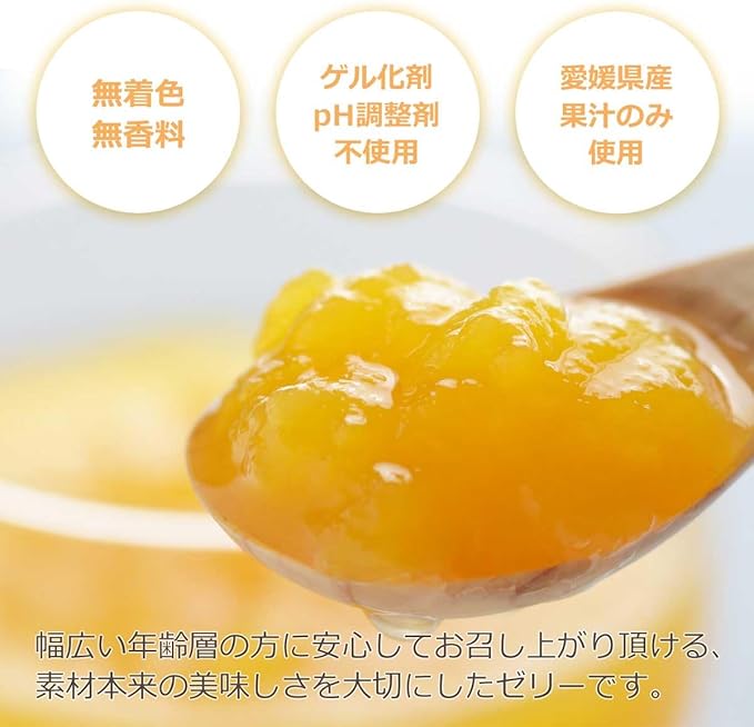 【愛媛県八幡浜市産の果汁、寒天、砂糖】シンプルな3つの原料からできた、ほろほろとほどけるような やさしい口当たりの飲むゼリー。