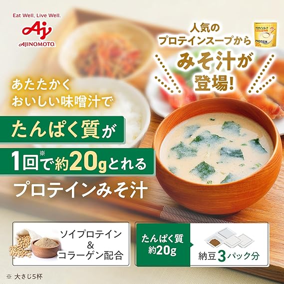 1食でたんぱく質20gを摂れる、温かく甘くないみそ汁味のプロテインです。
