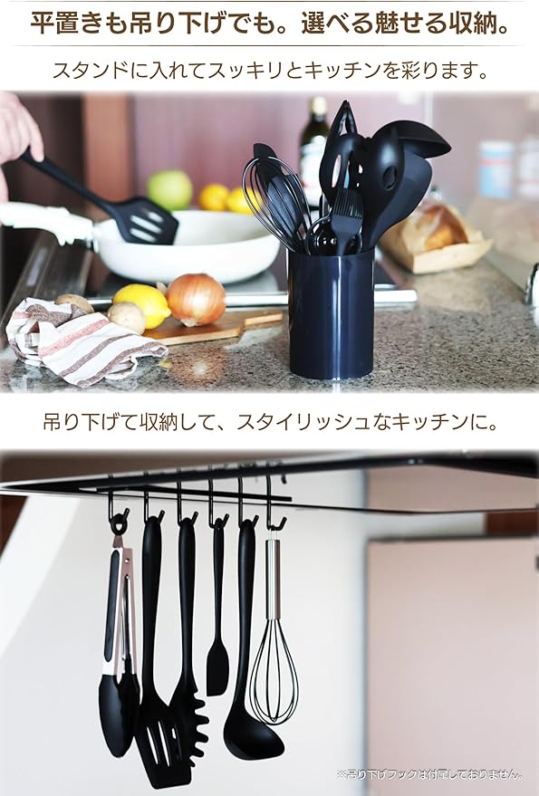 【内容】収納BOX、小スパチュラ、穴あきスプーン、パスタサーバー、トング、泡たて器、シリコンブラシ、大スパチュラ、レードル、ターナー、スプーン