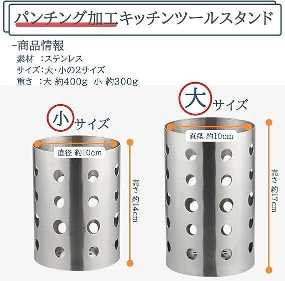 側面・底面ともにパンチング加工で水はけが良く、通気性にも優れたキッチンツールスタンド。大・小の2サイズ展開。