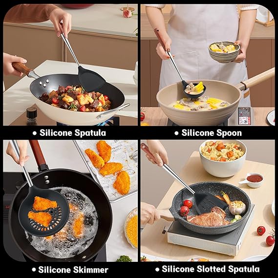 FJNATINH お玉 304ステンレス製中華鍋用ヘラ 中華鍋用具4点セット,ウォールナットシリカゲルヘッド