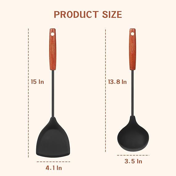 FJNATINHシリコーン中華鍋スパチュラとお玉ツールセット、ノンスティック耐熱ステンレス鋼調理器具BPAフリーキッチン用品調理器具、2個入り、ブラック a a