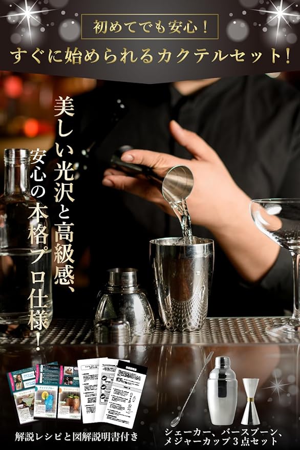 【はじめの一歩にちょうどいい|初心者向けカクテルセット】 「カクテル作りって難しそう…」 そう思っていた方にこそ選ばれている、初心者向けのカクテルスターターセットです。 必要な道具がすべて揃っていて、迷わず作れるイラスト入り説明書付き。 「家でカクテルを楽しみたい」を、今日から現実にしませんか?。