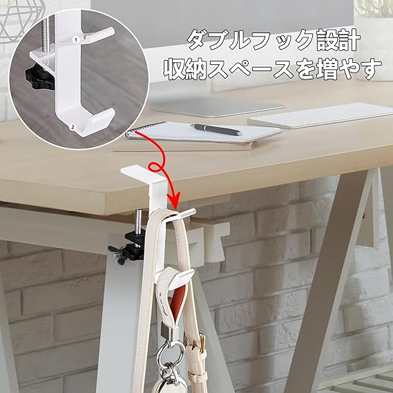 【BEAUTY PLAYER】テーブルフック バッグハンガー 調節可能 二層設計 耐荷重10kg 鞄掛け フック カバン フック クランプ フック デスク 机 荷物かけ キッチンツール 洗面所 戸棚下ハンガー 吊下げ 棚 フック 携帯便利 ホワイト 2セット a a