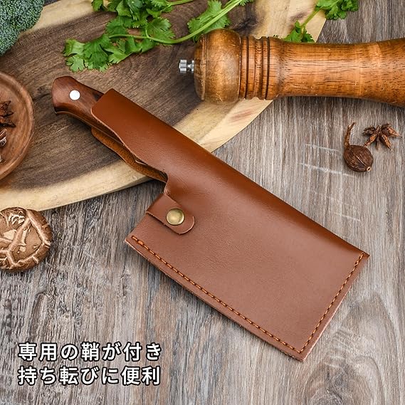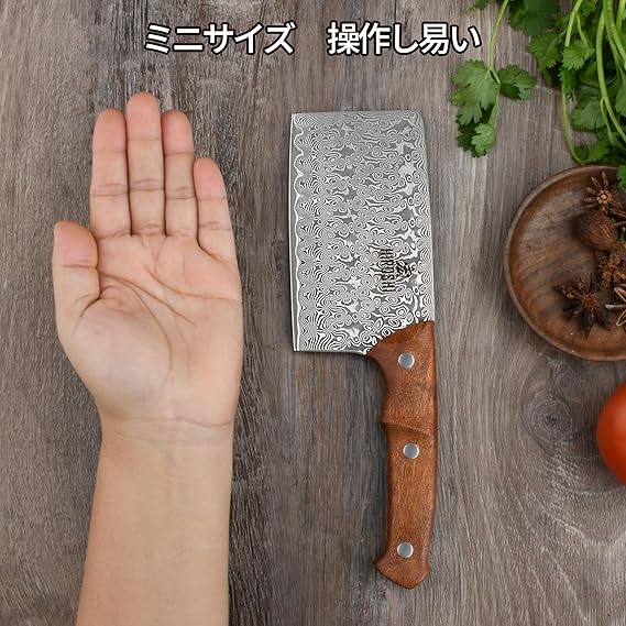 HIROSHI ダマスカス菜切り庖丁 小さい肉切り包丁 ミニ中華包丁 薄刃 両刃 超鋭い野菜包丁 軽い 錆びない 初心者と女性に最適 革鞘付きキャンプ 料理包丁 アウトドアナイフ a a