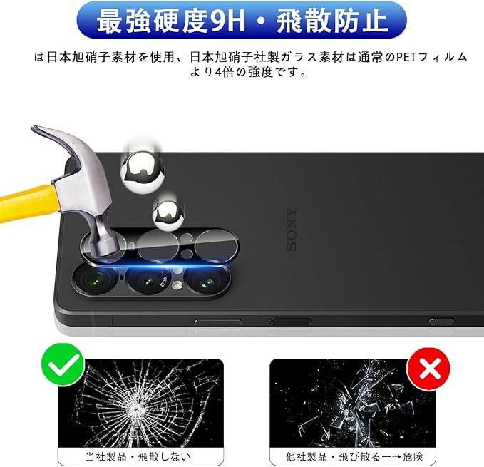 【飛散防止可能の9H硬度】 対応 エクスぺリア 1 VII レンズフィルム カメラ保護フィルムはす旭硝子で作られており、レンズ保護フィルムの中で最高レベルの9H硬度に達しています。手にフィットして持ちやすく滑りにくいので落ちにくいです。万が一落ちてもカメラフィルムが衝撃を吸収してくれるので、レンズ損傷を最低限まで抑えられます。また、特殊な飛散防止設計により、ガラスが割れて