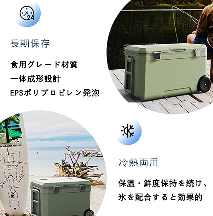 両側には移動時に便利なハンドルが付いています。350ミリリットル缶57本は、大人数キャンプにぴったり!大人でも座れる丈夫な体です。少し息抜きをしているとき、釣りをしているときなどに座ることができます。底部のユニバーサルホイールは、あらゆる場面で移動できるように設計されています。