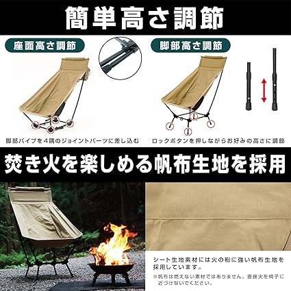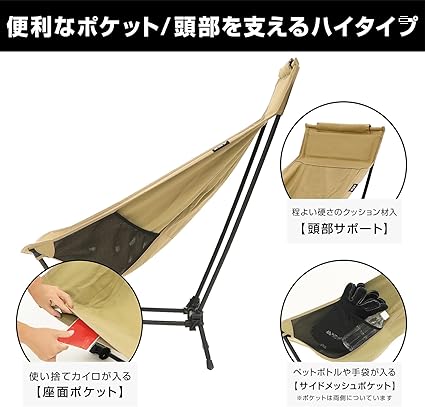 【焚き火を楽しめる帆布】シート生地素材には火の粉に強い帆布生地を採用しています ※帆布は燃えない素材ではありません。直接火を椅子に近づけないでください 【便利なポケット】ポケットには使い捨てカイロやペットボトル、雑誌や小物を入れられます 【頭部を支えるハイタイプ】頭部には