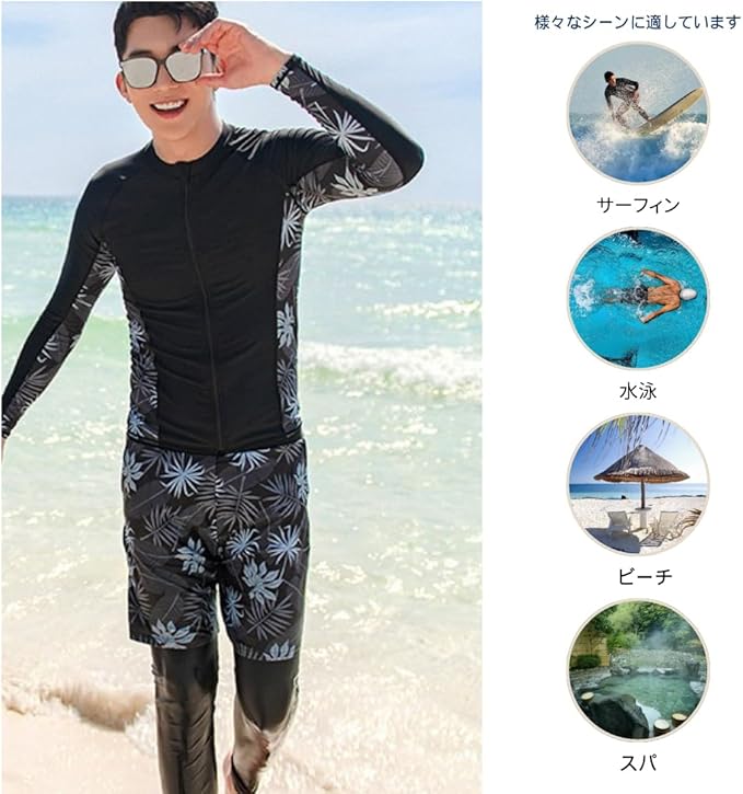 [wechose] ラッシュガード 水着 メンズ 上下セット フィットネス水着 3点セット ジップ アップ 長袖 前開き スイミング サーフパンツ レギンス ビーチ 水泳パンツ UVカット UPF50+ 温泉 競泳 通気性 水陸両用 吸汗速乾 e