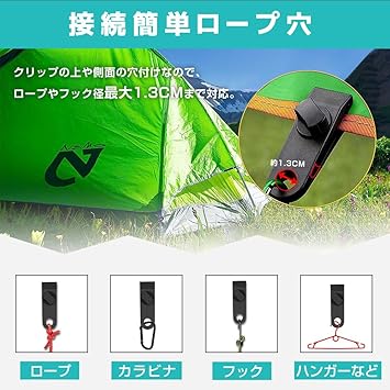 【製品仕様】サイズ:83mmx25mmx30mm(穴径13mm)。重量:約23g/個。パッケージ:10個のテントクリップ。材質:プラスチック。