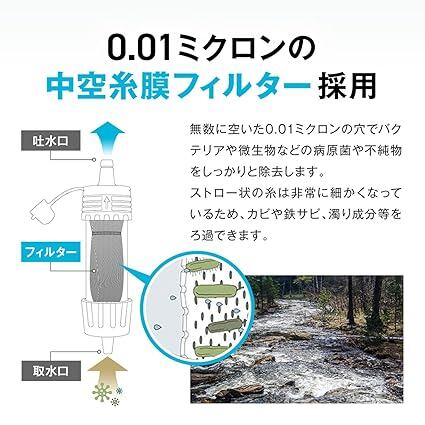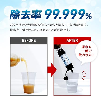 1.除去率99.999% バクテリアや大腸菌などをしっかりと除去して取り除きます。泥水を一瞬で飲み水に変えることが可能です。 2.フィルター交換なしで5000Lの浄水が可能 フィルター交換がなくて500mlのペットボトル1万本分が浄水できます。