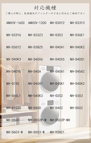 【対応パナソニック乾燥機機種】ANH3V-1600、 ANH3V-1200、NH-D30Y2、NH-D33Y3、NH-D33Y6、NH-D33Z3、NH-D353、NH-D36E1、NH-D36Y2、NH-D38Z5、NH-D40A1、NH-D40K2、NH-D40K3、NH-D40X6、NH-D40X5、NH-D40S1、NH-D40Y5、NH-D45A、NH-D45A1、NH-D45A2、NH-D150、NH-D45H1、NH-D45K1、NH-D45K2、NH-D45L1、NH-D45K3