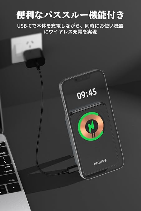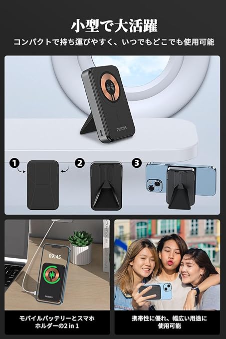 Philips マグネット式 10000mAh MagSafe ワイヤレスモバイルバッテリー 小型 携帯充電器 大容量 2台同時充電 パススルー機能/入出力USB-Cポート/スタンド付き PSE認証済 機内持込可能 DLP2716QB a