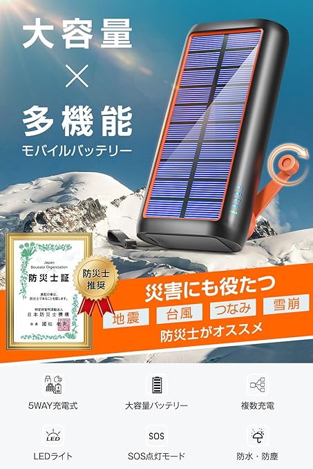 ソーラーモバイルバッテリー 手回し充電 【2025新登場 & 急速充電 ・出入力最大3A 】 ソーラーチャージャー 61200mAh 防災士監修 4本ケーブル内蔵 Type-C モバイルバッテリー ソーラー IPX7防水 耐衝撃 携帯 スマホ充電器 LEDライト付き 停電対策 SOSモード 地震/災害/旅行/アウトドア iPhone/Android各種デバイス対応 (オレンジ) a