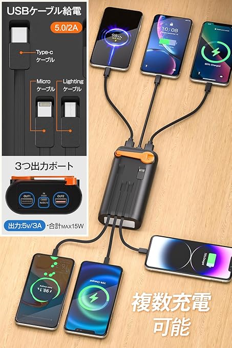 【超大容量61200mAh&急速充電対応・出入力最大3A 】大容量61200mAhにより、使った各機種に複数回も充電可能。入出力兼用Type-Cポートを搭載し、スマホやタブレットはもちろん、モバイルWi-Fiルーター、携帯ゲーム機など幅広く高速充電できるため、日頃の使用だけでなく、台風、地震など災害時の非常用電源としても、電熱ベスト用バッテリーとしても適しており、電池切れの心配はありません。・出入力最大3A の充電速度は従来の2.5倍速、どのタイプのスマホもよりスピーディーな充電が実現されます。