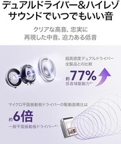 【フラッグシップレベルの音質へと進化】ダイナミックドライバーユニットに、独自開発のマイクロ平面振動板ドライバーユニットも加わり、幅広い再生周波数帯域を実現。迫力のある低音に加え、音楽をより解像度高く再現することができます。さらに、低音域の11mmのデュアルマグネットダイナミックドライバーを改良し低音域駆動力も向上。SBC、AAC、LDACに対応し、ハイレゾ認証を取得しています。