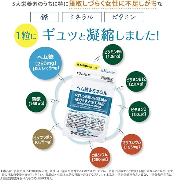 富士フイルム ヘム鉄&ミネラル (30日分) 女性に必要な8種の成分 (ヘム鉄 ビタミンB6 B12 D マグネシウム カルシウム 葉酸 イソフラボン) サプリメント 鉄分 [栄養機能食品] a