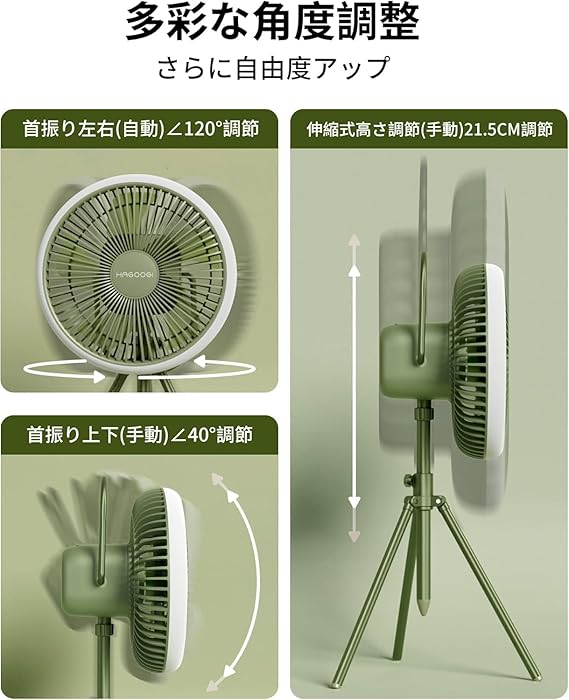 【超音波方式で蚊を撃退】 HAGOOGI キャンプ 扇風機 コードレス 10000mAh モバイルバッテリー 自動首振り LEDライト リモコン 付き 多機能 アウトドア 吊り上げ ファン 長時間連続使用 卓上 充電式 扇風機 風量調節 リズム風 静音 キャンプ用品 グリーン a