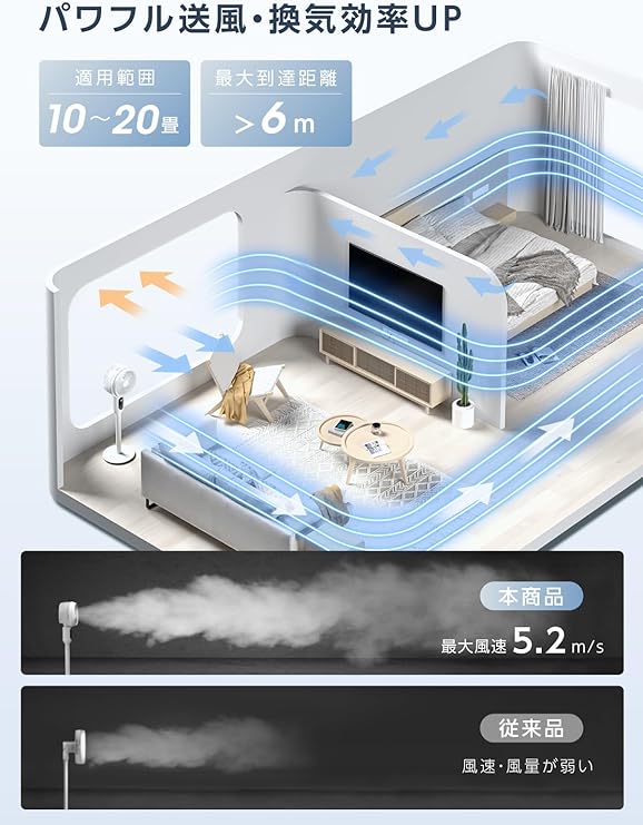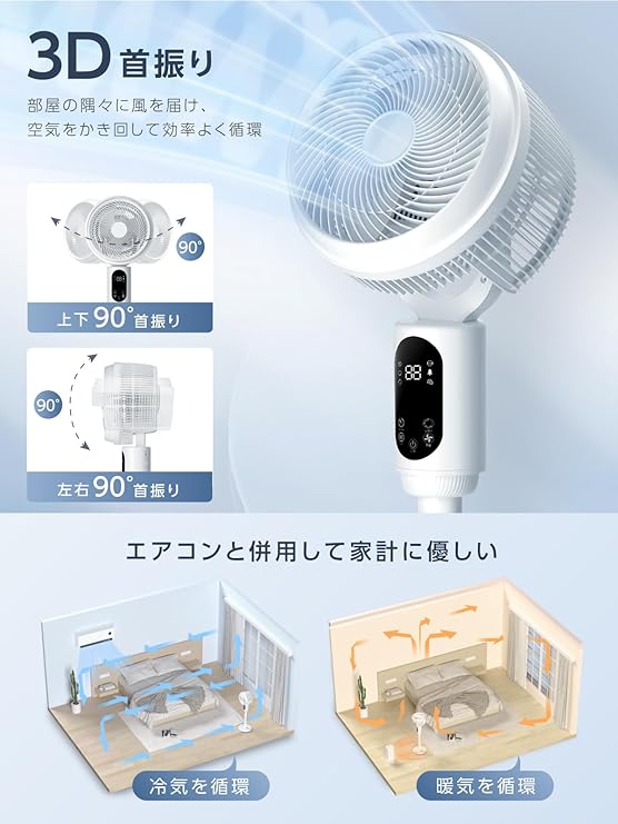 【一年中使えるサーキュレーター・360度首振り】季節の変わり目に合わせて、様々な使い方ができるサーキュレーターです。夏には風を送り、冬には暖房器具と組み合わせて部屋全体を暖かくします。初春や梅雨の季節には、換気や衣類の乾燥、部屋干し、空気の循環など、さまざまな用途に対応します。また、上下や左右に90度首振りするだけでなく、3D回転(上下左右同時)も可能です。風の流れが立体的になり、全方向に広がるため、より効果的な空気循環がを実現します。