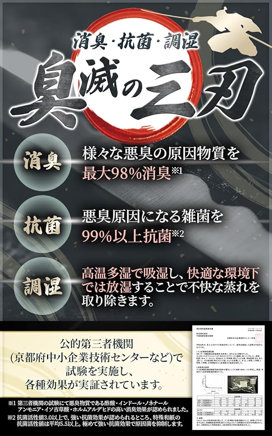 商品について 【靴に入れるだけの消臭袋】 袋状で靴に入れるだけ。足臭・ムレ・菌をまとめて対策できる靴用消臭剤です。 【特殊和紙で消臭&抗菌】 イソ吉草酸を最大98%除去※。抗菌活性値5.0以上でニオイの元を抑制。 【調湿で快適!梅雨のジメジメ・靴のムレ対策に】 湿気を吸収・放出してムレを強力防止。菌が繁殖しにくい快適な靴内環境を保ちます。 【再利用できてエコ】 天日干しやドライヤーで再生。使い捨て不要で環境にやさしいサステナブル設計。 【無香料・日本製の安心品質】 香料不使用。麻・藁・ウコン
