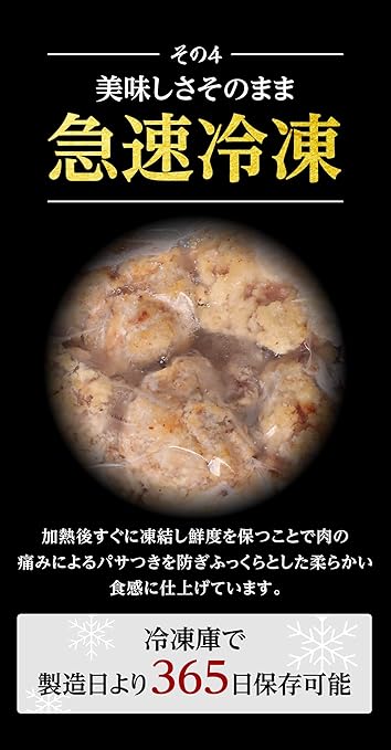 ≪簡単調理≫ ◎レンジで調理の場合は、皿に唐揚げを広げラップをせずに500w約3分!温めます。 温めが足りない場合は10秒ずつ様子を見ながら追加で温めてみてください。 ※温めすぎますと固くなるのでご注意ください。 レンジ加熱のみですとしっとりした衣の唐揚げに仕上がります。 ◎カリッと仕上げたい場合はレンジで温めた後にオーブンで温めてください。 あごだしとしょうがの香る味付けで十分おいしくお召し上が