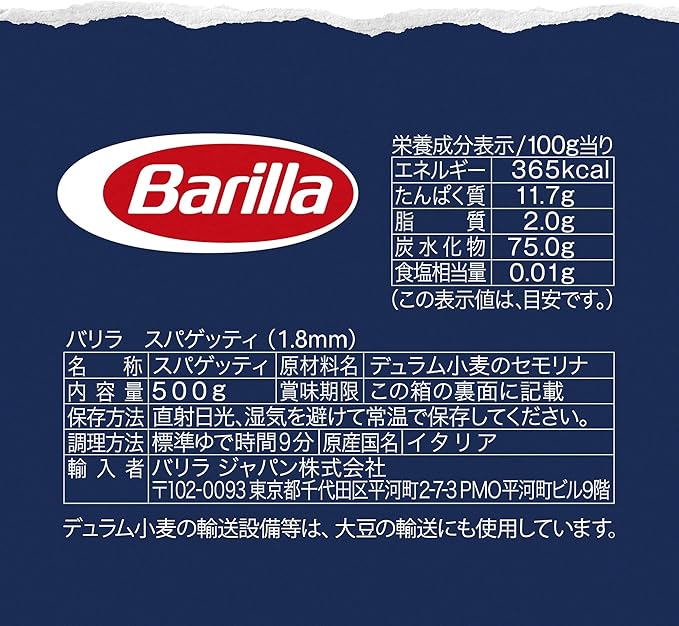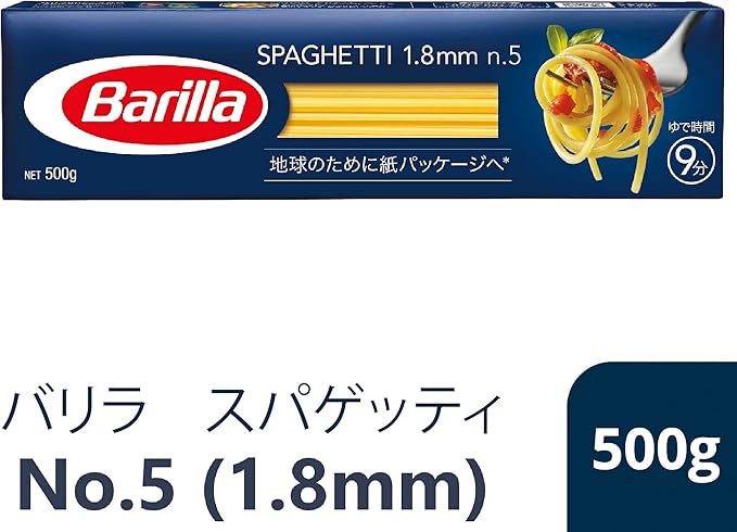 特徴:厳選されたデュラム小麦のセモリナ100%で作られています。バリラNO.5(1.8㎜)は、重たいソースのボロネーゼやカルボナーラなどにお勧めです。本格的なイタリアン料理を作ることができます。
