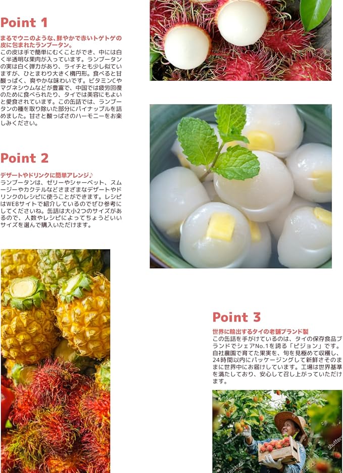トロピカルフルーツ・ランブータンの果肉の中央にパイナップルを詰めた、かわいい形状のフルーツ缶です。タイの老舗食品メーカー「ピジョン」が自社農園で栽培したフルーツの中でも、厳選したもののみを製品に使用しています。