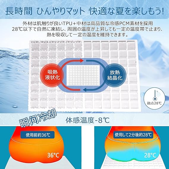 【熱中症対策・瞬間冷感】NASAのために開発されたPC-M特殊冷却素材を採用。熱を吸収・発散することで、一定の温度を保つ性質があります。心地よいヒンヤリ感を長時間キープすることで体の熱を吸収し、熱中症対策に役立つひんやりマット・アイス枕です。