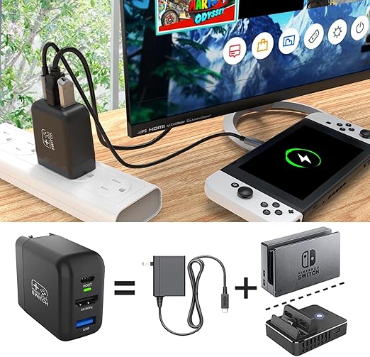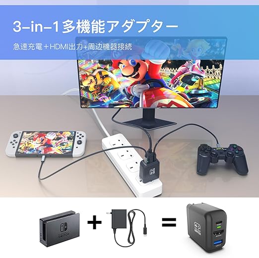 【Switch 3 in 1 ACアダプター】SwitchアダプターにはHDMIポート、USB 2.0ポート、Type-Cポートが内蔵されており、充電用のUSB-C端子、画面出力用のHDMI端子、周辺機器用のUSB-A端子、このSwitch ドック充電器は、オリジナルのSwitch ドックとAC充電アダプターの理想的な代替品であり、お金とスペースを節約できます。