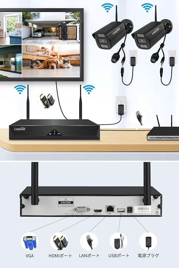 防犯カメラ 屋外 ワイヤレス Logisaf 24時間録画 300万画素 防犯カメラセット 2台 10台増設 wifi 監視カメラ 屋外 夜間カラー撮影 動体検知録画 AI人体検知 ワイヤレス防犯カメラ リピータ 遠隔監視 Eseecloudアプリ 警報通知 IOS/Android 双方向通話 日本語説明書 IP67防水防塵 適格請求書(カメラ2台+500万録画機+HDD内蔵) a