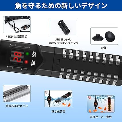 カバー付き:難燃性カバー付きで、ヒーター部の熱から人の手や魚を守ります。カバーは取り外してお手入れ可能です。また、保護カバー