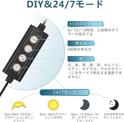 【diyモード】フルスペクトルの水槽照明は、時間+明るさ+色調整可能です。 ①時間設定(タイマーキー